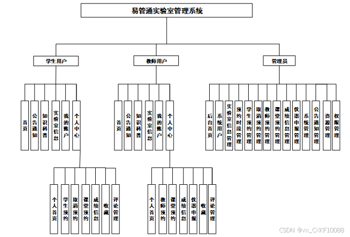 按照易管通实验室管理系统的角色,划分为了学生用户模块、教师用户模块和管理员模块这三大部分。