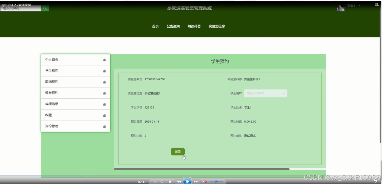 在个人中心学生可以查看预约实验室详情,还可以预约实验室进行相关实验操作。学生预约界面图如下图所示。