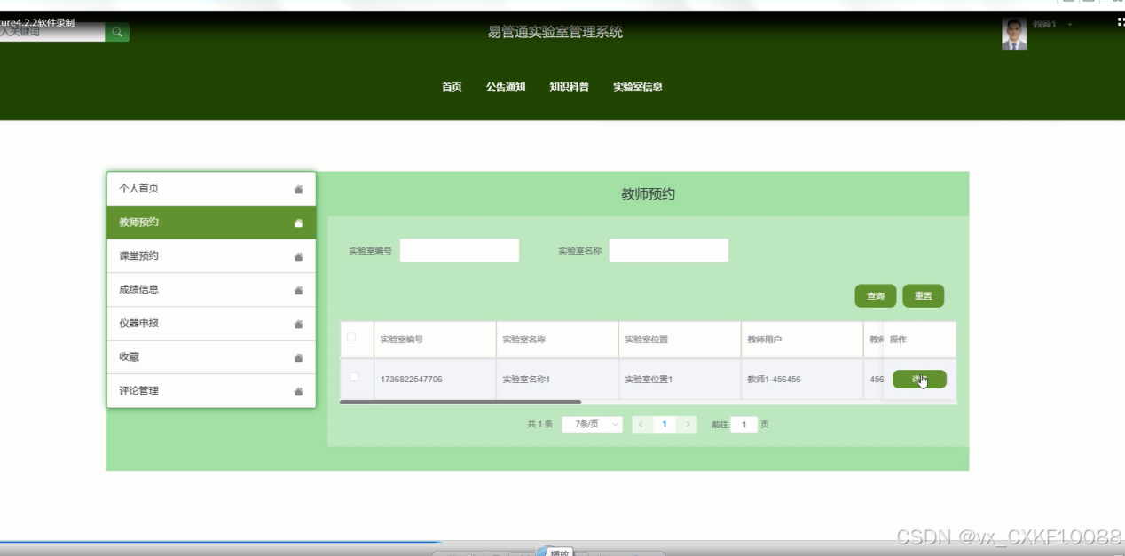 教师用户在个人中心点击“教室预约”,可以查看教室预约详情实验室名称、实验室编号等信息,还可以进行查询和重置等操作。教室预约如下图所示。