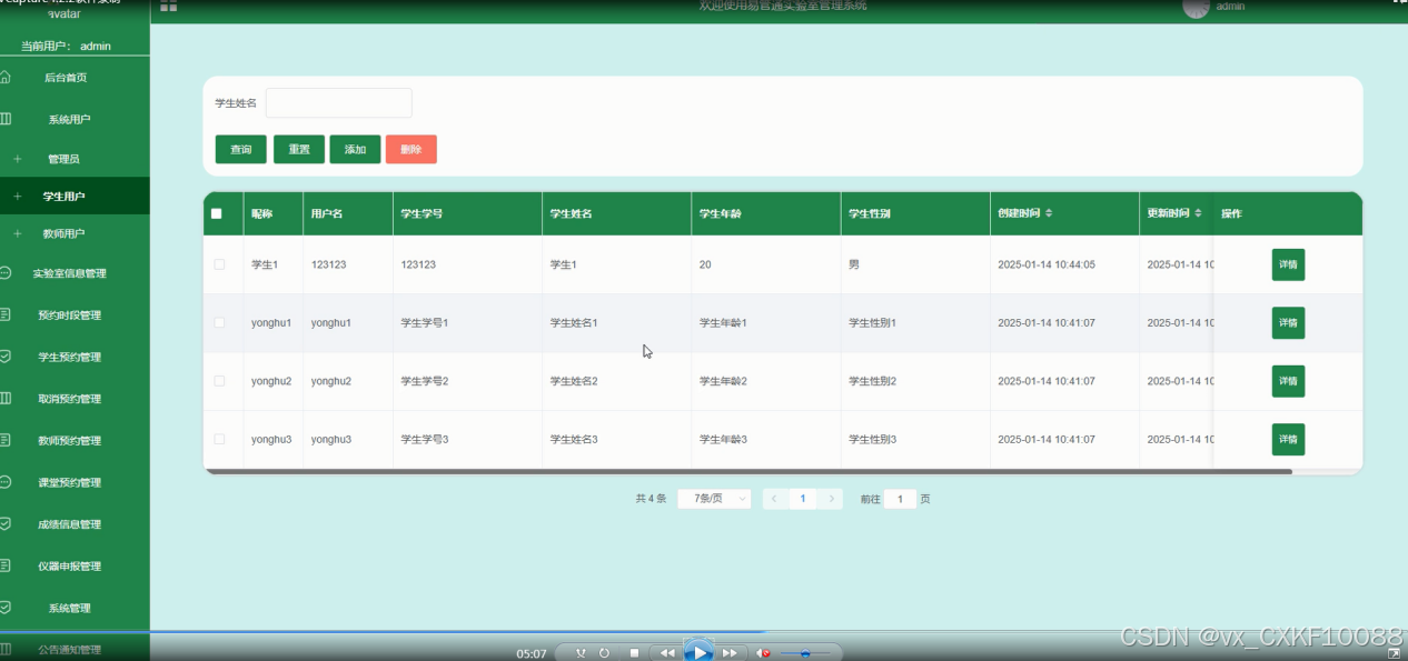 在系统用户页面中可以对管理员、学生用户和教师用户三种角色进行管控,还可以对三种角色进行查询、重置、添加和删除。系统用户界面如下图所示。