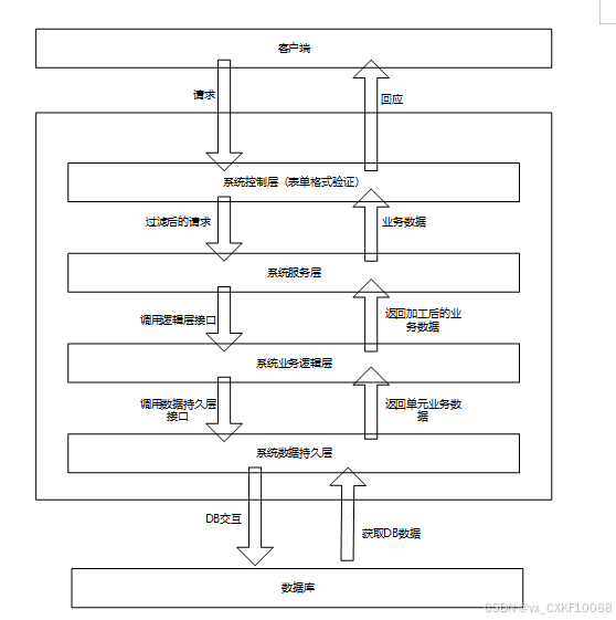 页面发送请求给控制器,控制器调用业务层处理逻辑,逻辑层向持久层发送请求,持久层与数据库交互,后将结果返回给业务层,业务层将处理逻辑发送给控制器,控制器再调用视图展现数据。
