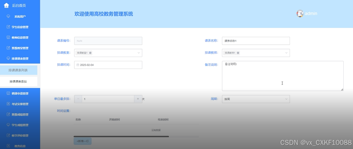 排课课表管理:添加、修改和删除课程排课信息。课表生成:根据排课信息生成班级课表,支持导出功能。课表查询:按班级或教师查询课表信息。