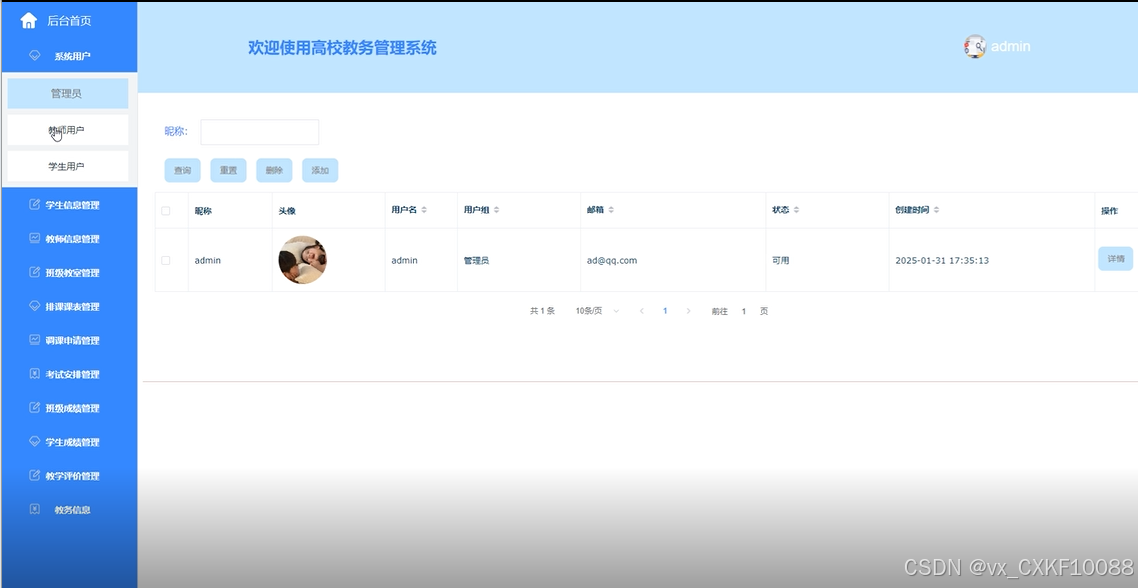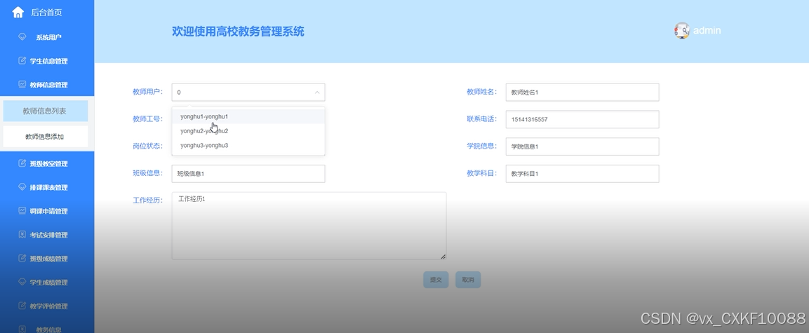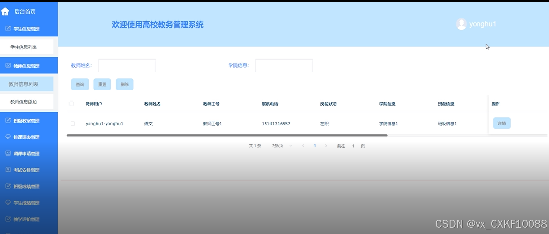 - 教师信息管理:添加、编辑和删除教师信息(如姓名、工号、职称等)。教师资历记录和管理教师的教学经历、学历、研究方向等信息。支持根据条件查询教师信息。