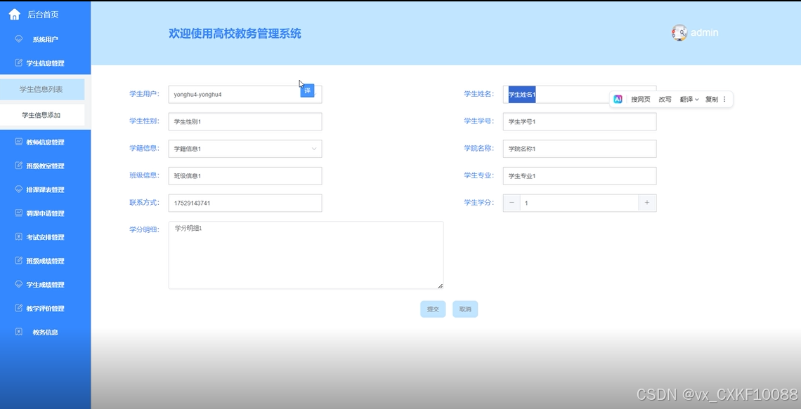 学生信息管理:添加、编辑和删除学生基本信息(如姓名、学号、联系方式等)。学生查询:根据条件查询学生信息,支持多条件筛选。