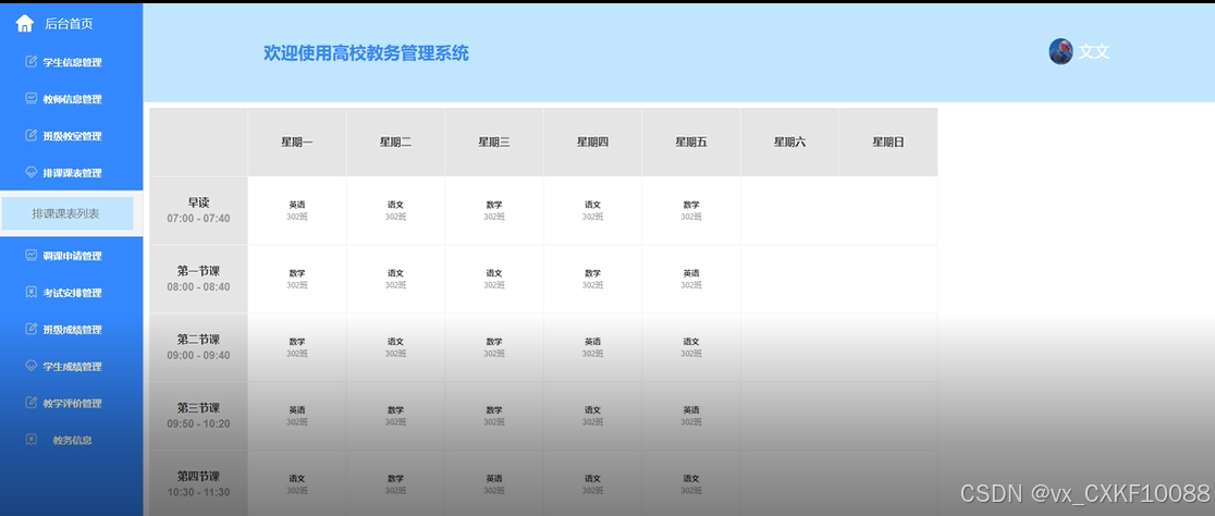 - 排课课表管理:添加、修改和删除课程排课信息。课表生成:根据排课信息生成班级课表,支持导出功能。课表查询:按班级或教师查询课表信息。
