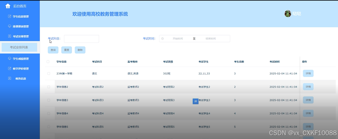 考试安排管理:查看各科目的考试时间、地点和考试形式(笔试、机试等)。学生可查看各科目考试成绩,方便了解学业情况。系统通过消息推送功能提醒学生即将到来的考试。界面如下图所示。