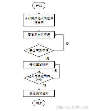 企业用户进入申请管理,查看新岗位申请。若有新申请,安排面试时间。检查是否有面试冲突,若无,则发送面试通知,完成流程。流程图如下。