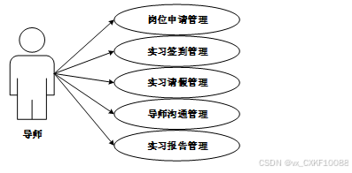 导师用户可进行岗位申请管理、签到数据查看、请假审批、学生沟通、实习报告评分等操作。导师用例图如下。