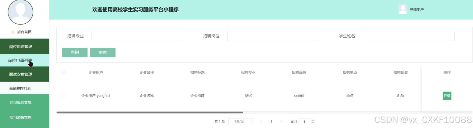 本平台通过技术手段解决上述问题,提供一个高效、便捷的实习服务平台。平台采用微信小程序作为前端技术,SpringBoot作为后端框架,MySQL作为数据库。通过这一技术架构,学生用户能够实现在线查看实习岗位、申请岗位、查看招聘活动、安排面试、进行实习签到和请假管理等功能;企业用户可以进行实习岗位管理、岗位申请管理、面试安排管理等操作;导师用户可以管理岗位申请、实习签到、请假及实习报告等;管理员可进行全平台用户管理、岗位申请管理、面试安排管理等全面操作。平台通过集成各方需求,提供高效的信息交流和管理平台,简化了各项流程,提高了工作效率,推动了高校与企业间的深度合作。