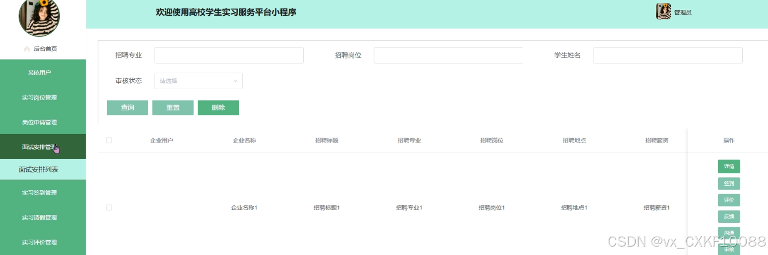 在面试安排管理模块,管理员查看企业与学生的面试安排情况。可进行签到、评价、反馈、沟通、审核等操作,对出现的问题进行协调解决。面试安排管理界面如图5-21所示。