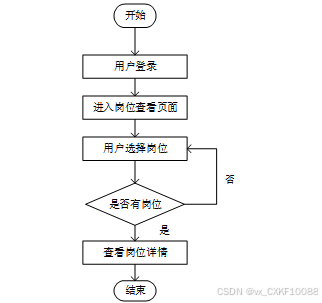 实习岗位查看的步骤:用户登录后进入赛事详情页面,选择岗位。如果有岗位,查看岗位详情;否则返回重新选择。流程从开始到结束,清晰地指导用户操作。流程如下所示。