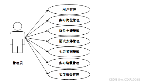 管理员可进行用户信息管理、岗位管理、申请流程管理、面试安排、签到管理、请假管理、报告管理等。管理员用例如下。