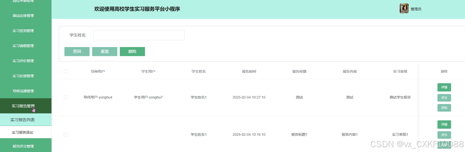 管理员在实习报告管理页面监督学生实习报告的提交和评阅情况。可进行查询、重置、删除、添加、评分等操作。实习报告管理界面如图5-24所示。