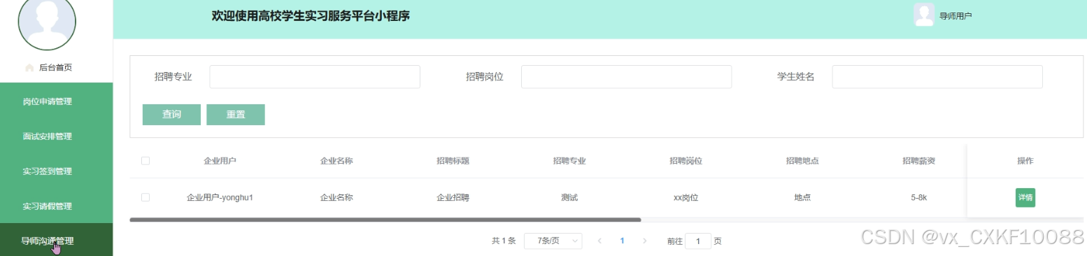 This platform solves the above problems through technological means and provides an efficient and convenient internship service platform. The platform adopts WeChat Mini Program as the front-end technology, SpringBoot as the back-end framework, and MySQL as the database. Through this technological architecture, users can achieve functions such as online viewing of internship positions, applying for positions, viewing recruitment activities, arranging interviews, checking in for internships, and managing leave requests; Enterprise users can manage internship positions, job applications, interview arrangements, and other operations; Mentor users can manage job applications, internship sign ins, leave requests, and internship reports, etc; Administrators can perform comprehensive operations such as platform wide user management, job application management, and interview arrangement management. The platform integrates the needs of all parties, provides an efficient information exchange and management platform, simplifies various processes, improves work efficiency, and promotes deep cooperation between universities and enterprises..