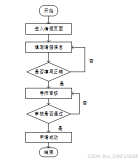 请假流程如下:用户登录后进入请假页面,填写请假信息。检查信息是否正确,若否则重新填写。信息正确后提交导师审核,审核通过则申请成功,流程结束。流程图如下。