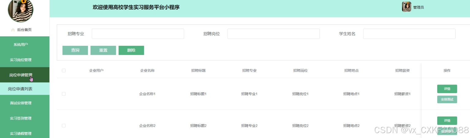 管理员在岗位申请管理页面监督学生的岗位申请流程。可进行审核申请并进行面试安排等操作。岗位申请管理界面如图5-20所示。