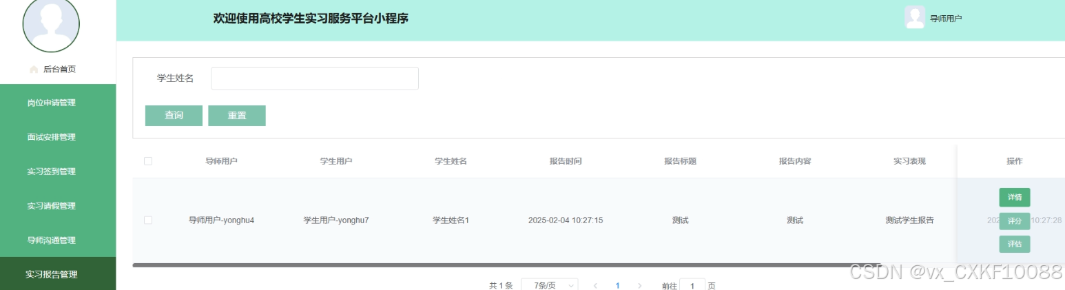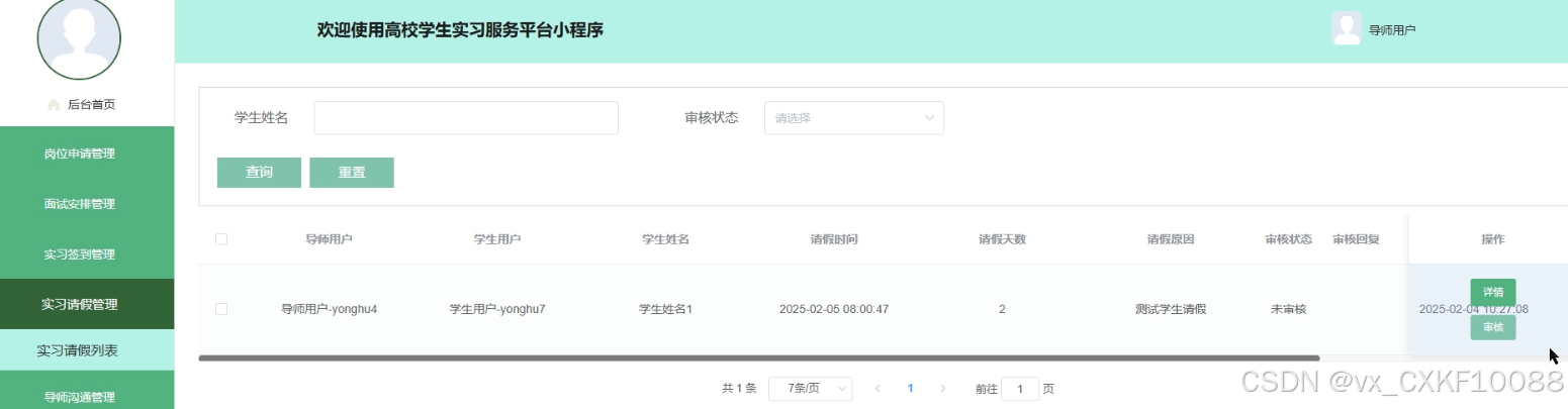 | 实习请假功能测试 | 1. 导师账号登录 2. 查看学生请假申请 3. 点击“通过”或“驳回” | 系统更新审核状态并记录操作人 | 通过 |