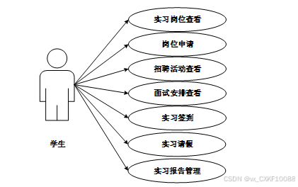 学生可进行岗位查看、岗位申请、招聘活动查看、面试安排查看、实习签到、请假申请、实习报告管理等操作。学生用户用例图如图3-1所示。