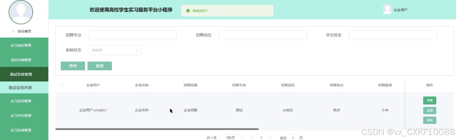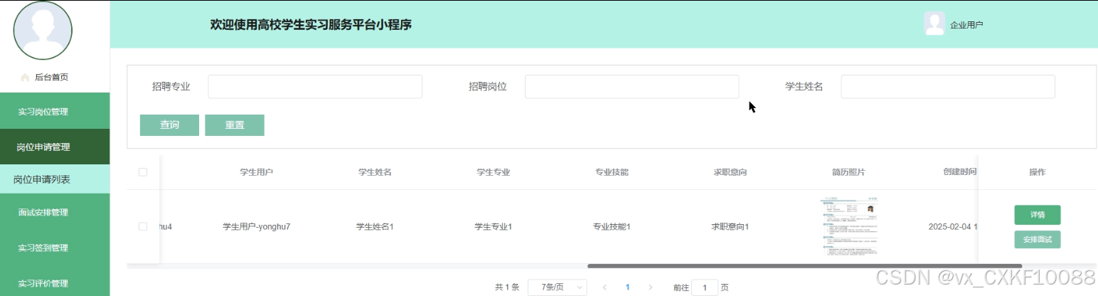 | 岗位申请功能测试 | 1. 企业账号登录后台 2. 查看岗位申请记录 | 成功查看所有学生申请记录 | 通过 |