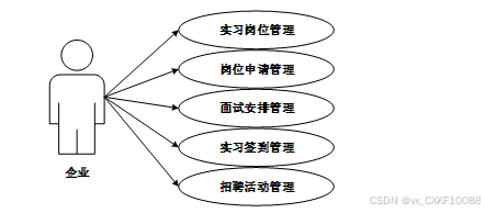 企业用户可进行岗位发布与管理、申请管理、面试安排、签到管理、招聘活动发布与管理等操作。企业用例图如下。