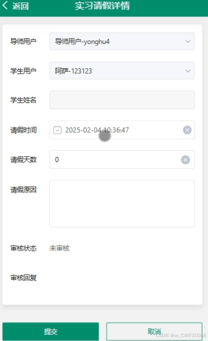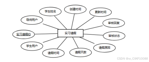 实习请假实体包括请假时间、请假天数、请假原因。实习请假实体如图4-10所示。