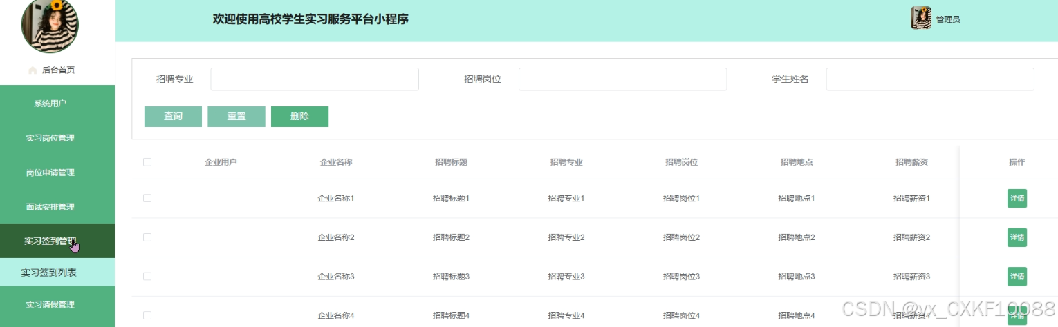 管理员在实习签到管理页面监督学生的签到记录。可查询、重置、删除实现签到信息。实习签到管理界面如图5-22所示。
