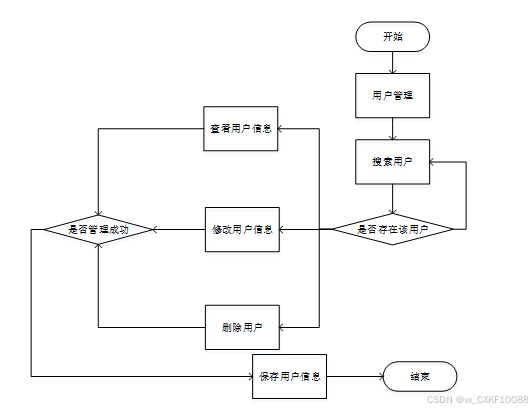 用户管理流程包括:开始后进行用户管理,搜索用户并检查用户是否存在。若存在,可查看、修改或删除用户信息。操作后保存信息,检查管理是否成功,结束流程。流程图如下。
