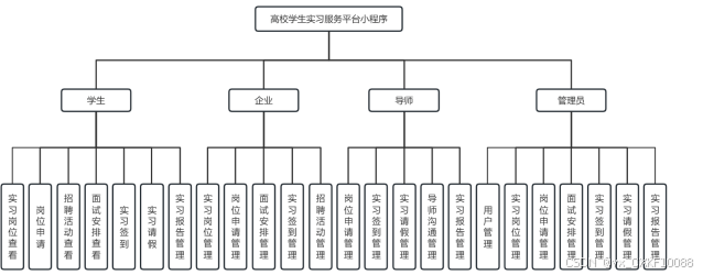 系统面向学生、企业用户、导师用户、管理员提供多角色实习管理服务。学生可进行岗位申请、面试查看、签到请假、报告管理。企业用户可管理岗位、审核申请、安排面试、管理签到与活动。导师用户可监督实习、审批请假、评阅报告。管理员统一管理平台数据。功能结构图如下。
