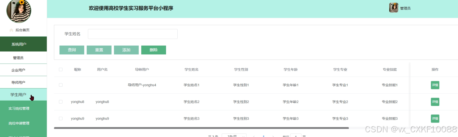 管理员登录后,进入用户管理页面,管理系统内的所有用户信息。可添加、编辑或删除学生、企业、导师等用户账号,设置权限,确保系统正常运行。用户管理界面如图5-18所示。