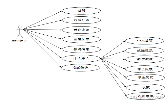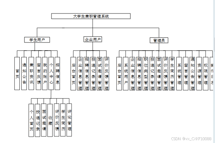 本大学生兼职管理系统设计分为三个主要用户角色:学生用户、企业用户和管理员。以下是对每个角色的功能需求的详细描述。