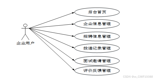 本系统采用Spring Boot框架,结合前后端分离架构,提升系统的性能、扩展性和可维护性。系统用户分为管理员、企业用户和学生用户,不同角色拥有相应的功能权限。管理员负责平台管理、招聘信息审核和数据统计,企业用户可发布招聘信息、管理简历投递、发送面试邀请,而学生用户能够浏览招聘信息、投递简历、接收面试邀请并管理求职记录。此外,系统支持通知公告、留言反馈、评价管理等功能,促进用户信息沟通,提高招聘匹配效率。