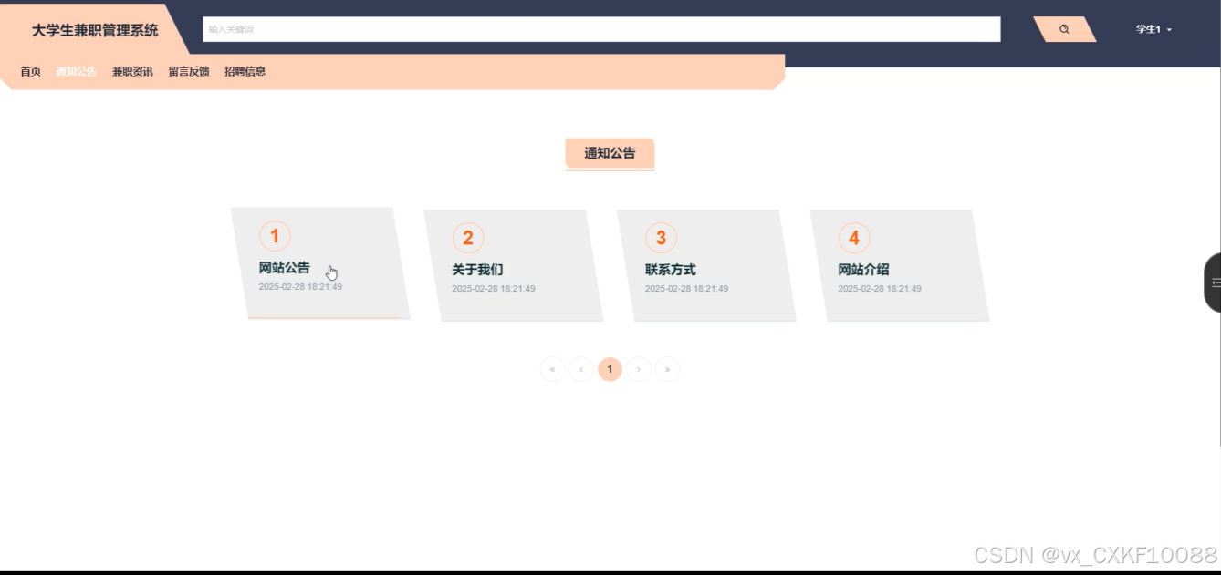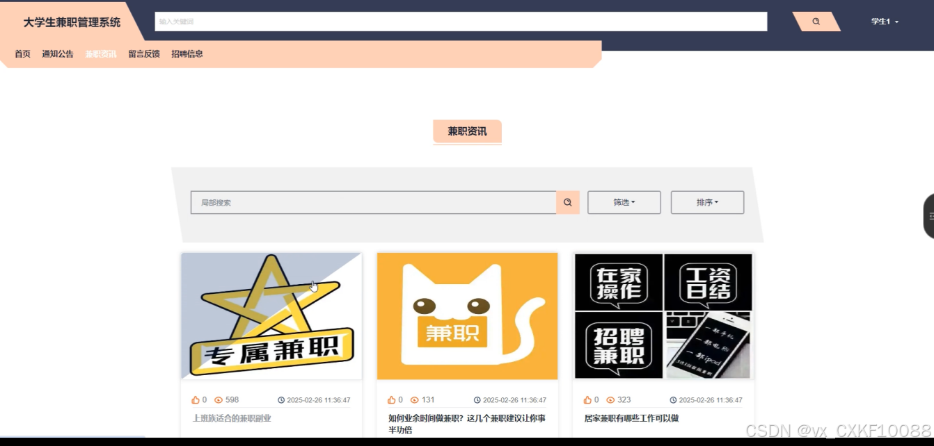 首页:展示最新的兼职招聘信息、通知公告和兼职资讯,帮助学生了解最新的就业机会。