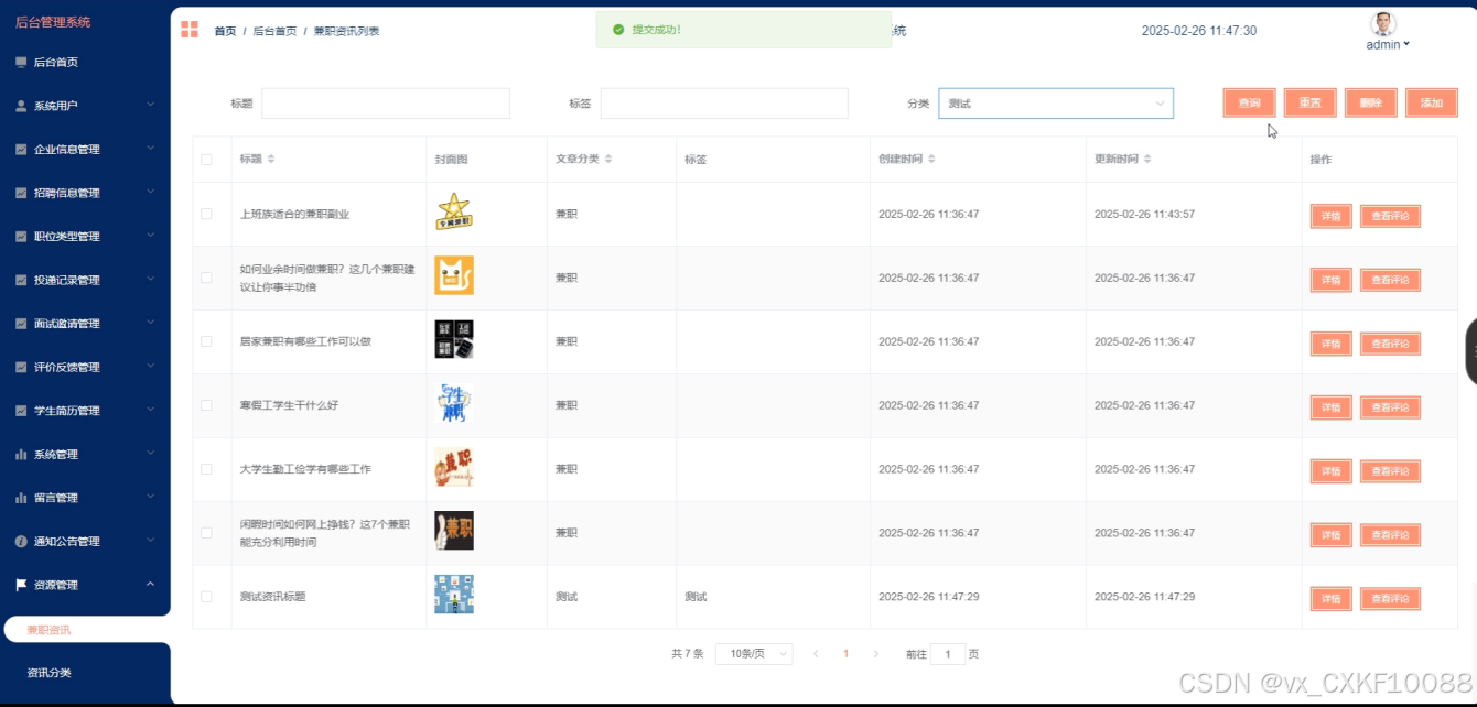 资源管理(兼职资讯、资讯分类):管理员可以管理平台上的兼职资讯和资讯分类,为用户提供有价值的信息。