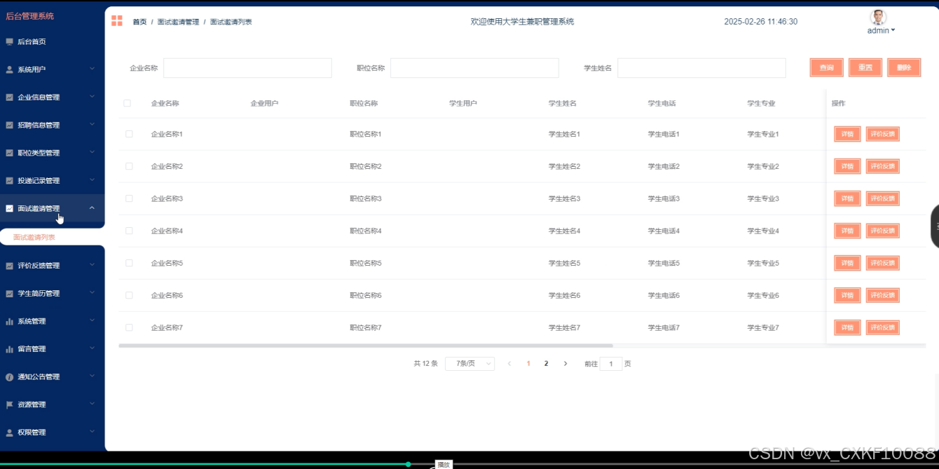 面试邀请管理:管理员有权限查看并管理企业发送给学生的面试邀请。