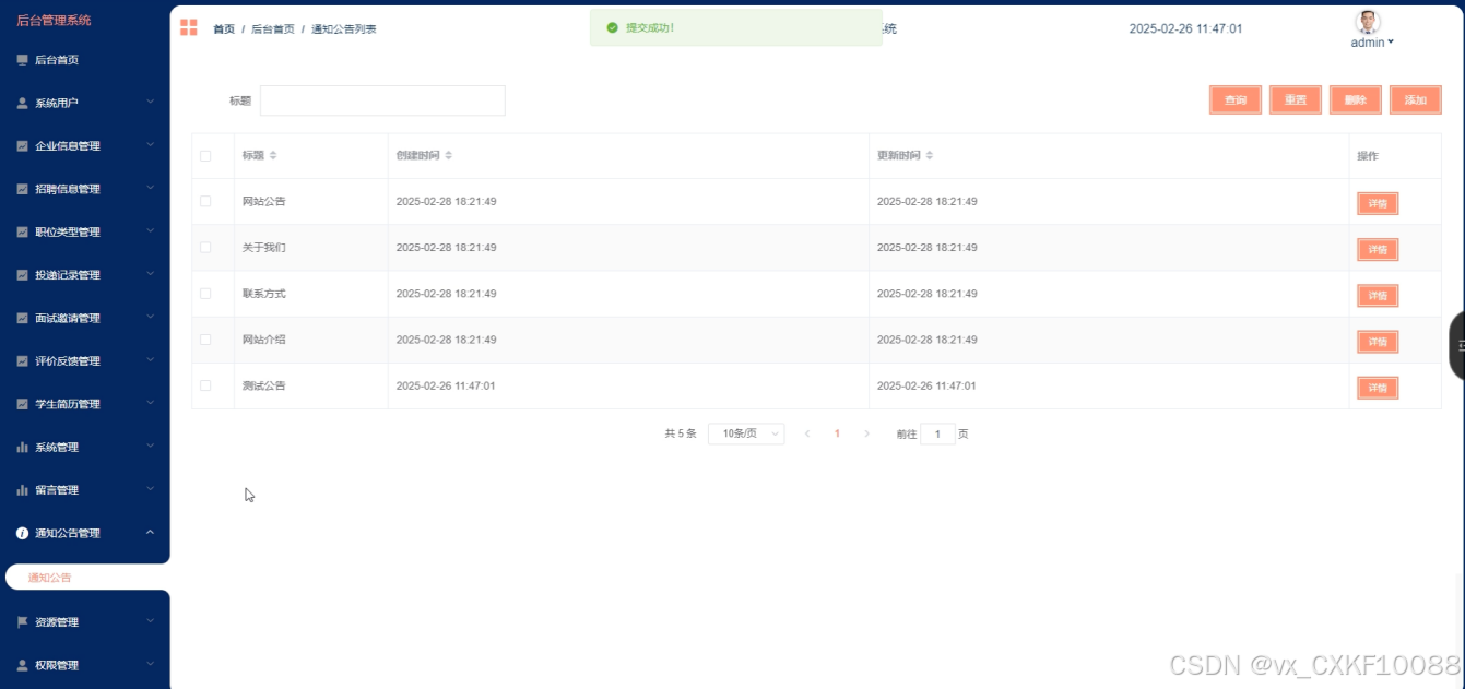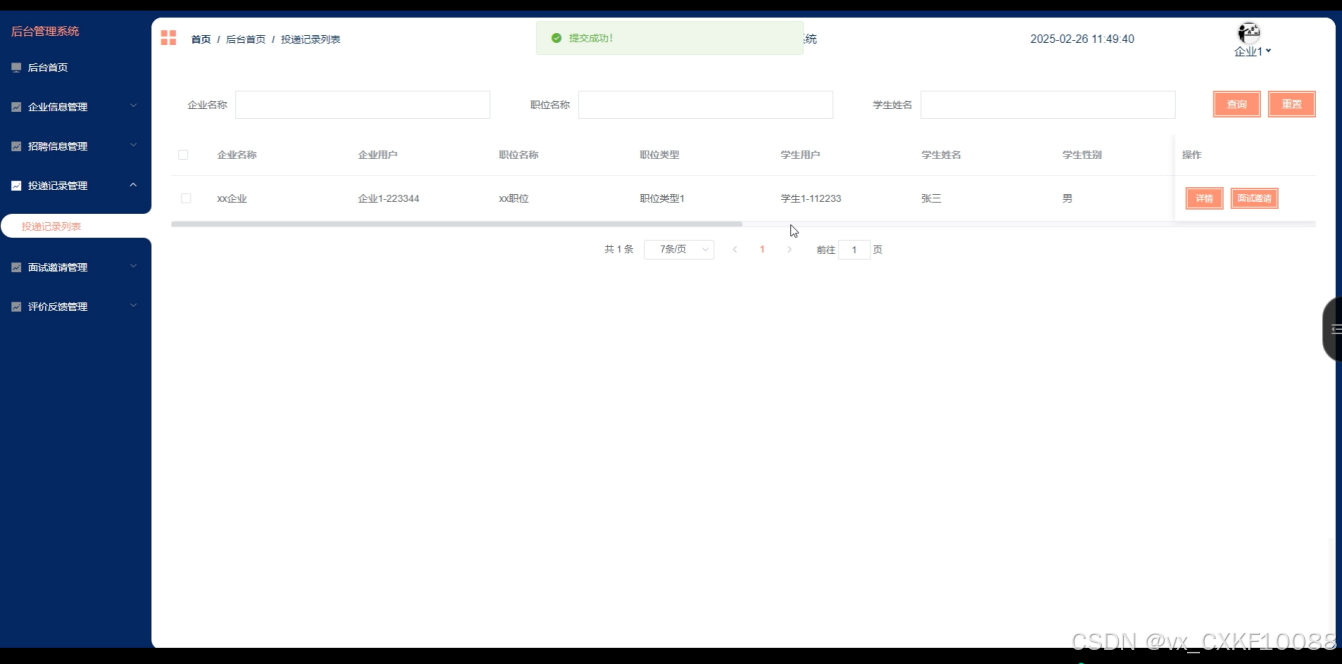 投递记录管理:管理员可以查看所有学生投递的记录,方便对招聘信息进行跟踪和分析。