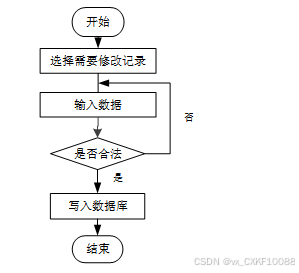 用户首先选择需要修改的记录,输入修改后的数据,系统判断输入数据是否合法。若数据不合法,提示重新输入;若数据合法,则将修改后的数据写入数据库,完成操作后流程结束。修改信息流程图如图3-7所示。