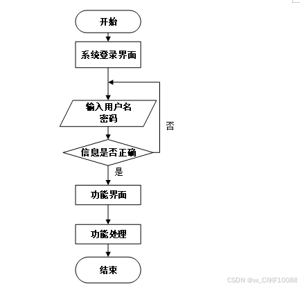 用户首先进入系统登录界面,输入用户名和密码后,系统验证信息是否正确。若验证失败,返回登录界面重新输入;若验证成功,则进入功能界面,执行相应功能处理后结束操作流程。操作流程如图3-5所示。