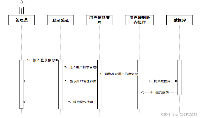 管理员输入登录信息后,进入用户信息管理模块,选择增删改查操作并提交命令至数据库。数据库执行操作后返回成功状态,系统显示用户管理界面并提示操作成功。管理员修改用户信息时序图如图4-5所示。