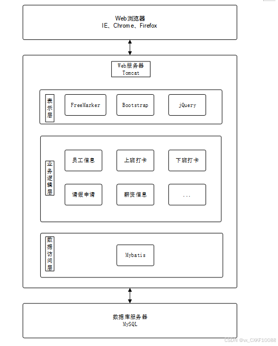 系统由表现层、业务逻辑层、数据访问层和数据库服务器组成。表现层通过浏览器(如IE、Chrome、Firefox)与用户交互,采用FreeMarker、Bootstrap、jQuery等技术实现界面呈现。业务逻辑层负责处理系统的核心业务逻辑,通过分模块设计实现功能分离。数据访问层使用MyBatis框架连接数据库,执行数据的增删改查操作。数据库服务器采用MySQL进行数据存储和管理,为系统提供稳定的数据库支持。整个架构通过Tomcat服务器完成用户请求的接收和处理,确保系统的高效运行[8]。整个系统架构如图4-1所示。