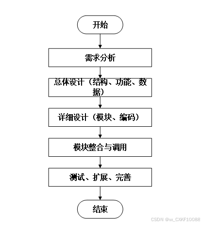 系统开发流程的主要步骤,从需求分析到系统完成的全过程。流程包括需求分析、总体设计(结构、功能、数据)、详细设计(模块、编码)、模块整合与调用,以及测试、扩展和完善,最终完成系统的开发。本系统的开发流程如图3-3所示