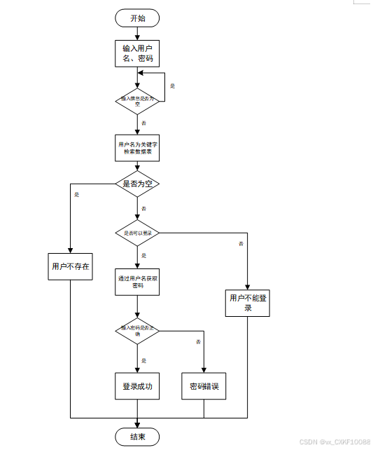 用户输入用户名和密码后,系统先检查输入是否为空,再验证用户名是否存在,若存在则通过用户名获取密码并校验。若密码正确则登录成功,否则提示密码错误。若用户名不存在或无法登录,提示用户操作无效。如图3-4所示。