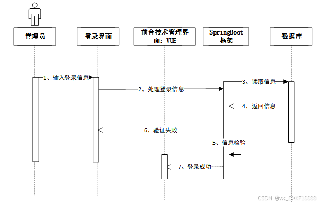 管理员输入登录信息后,登录界面将信息传递至前台管理界面,随后通过SpringBoot框架读取数据库中的用户信息并返回。系统验证信息,若验证成功则登录成功,若验证失败则返回错误提示。登录时序图如图4-4所示。