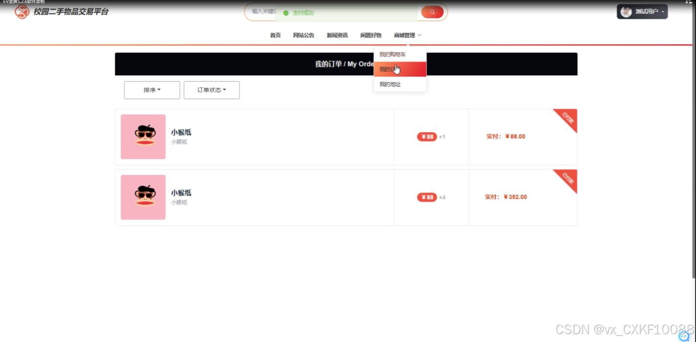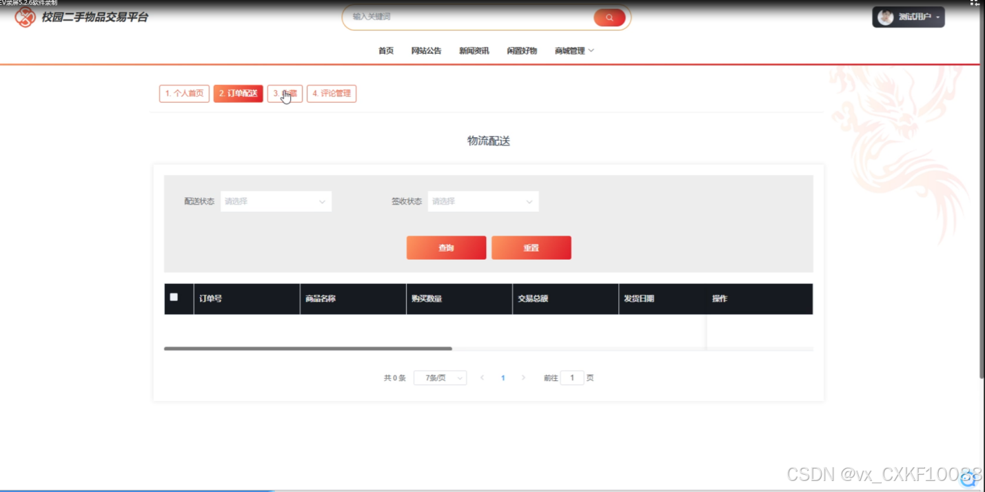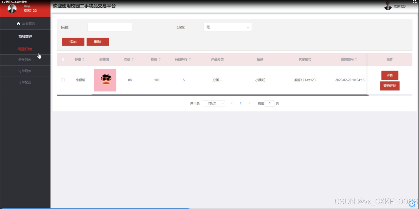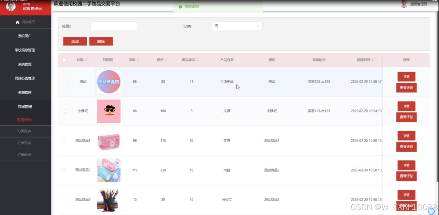 - 商城管理:售卖用户可以在此功能查看,闲置好物、分类列表、订单列表、订单配送等功能,查看商城中待售的二手或剩余商品,方便用户浏览和校园二手物品交易平台,将商品按照类别进行划分,便于用户根据需求快速找到想要的商品。并列出所有订单详情,方便管理者跟踪订单状态和处理订单。还可以管理订单的配送流程,确保商品能够准确无误地送达客户手中。允许售卖用户添加、重置、删除、详情、查看评论帮助改进商品和服务质量。