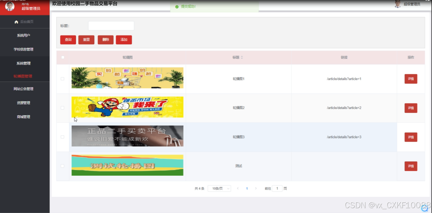 系统管理:管理员可以管理系统中的轮播图,进行轮播图的查询、重置、添加、删除等操作,以优化页面展示效果。同时,管理员还可以进行系统设置和维护,确保系统的稳定运行。轮播图管理模块如下图所示。
