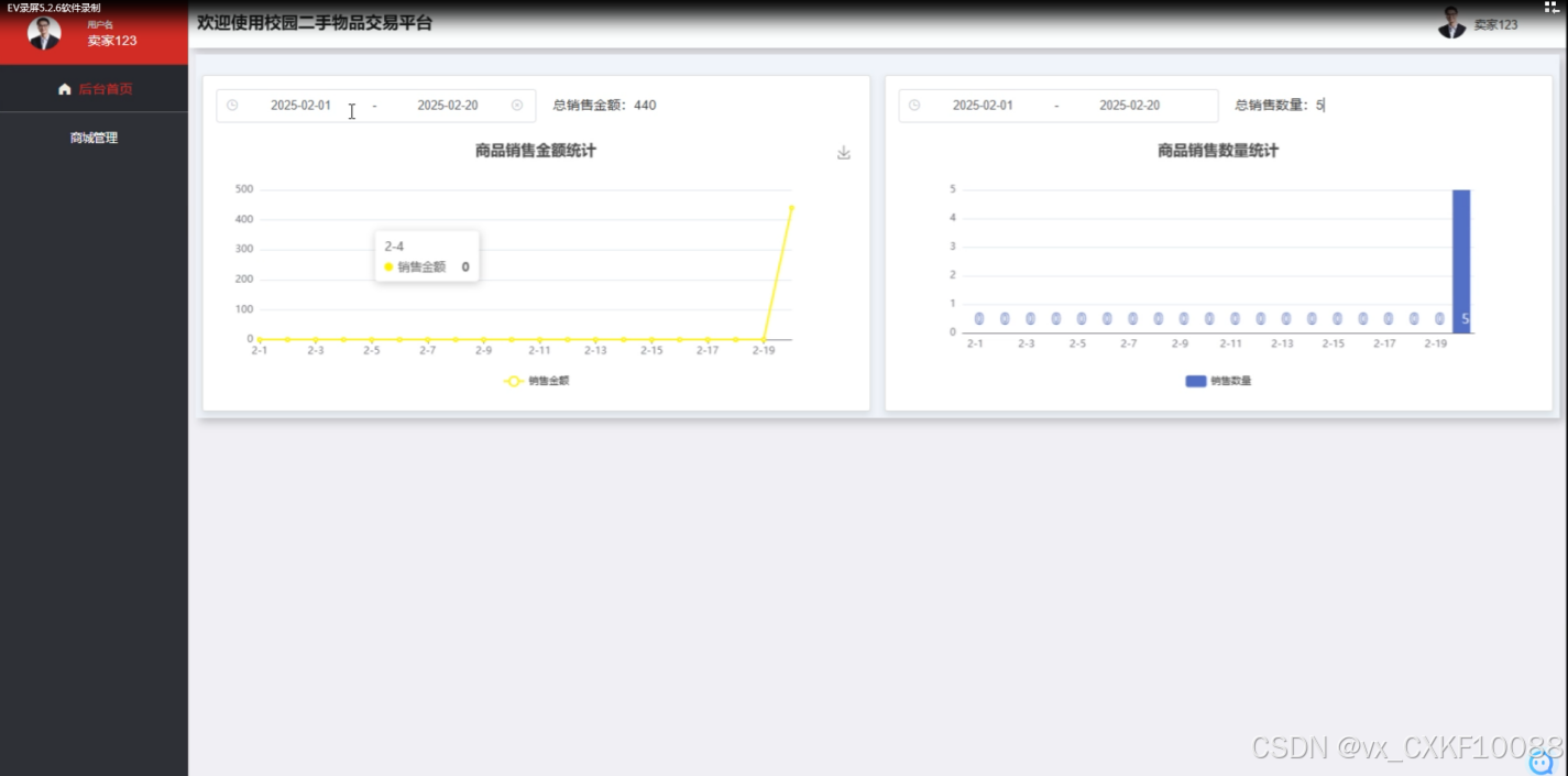 - 后台首页:管理员可以直观地查看商品销售金额统计和商品销售数量统计,通过数据图表和报表,快速掌握销售趋势和业绩情况。