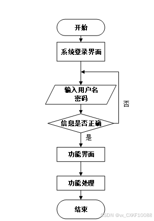 用户首先进入系统登录界面,输入用户名和密码后,系统验证信息是否正确。若验证失败,返回登录界面重新输入;若验证成功,则进入功能界面,执行相应功能处理后结束操作流程。操作流程如图3-6所示。