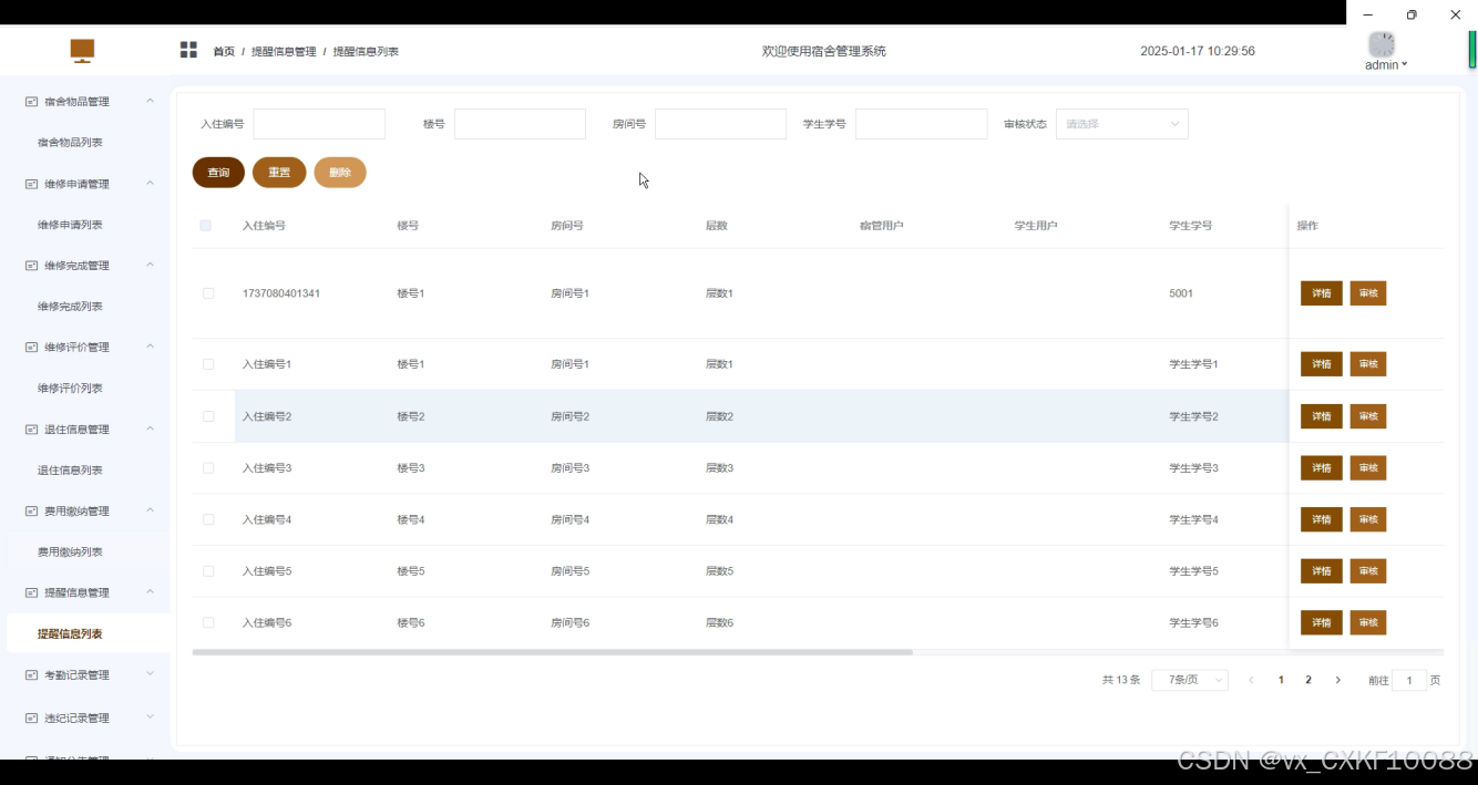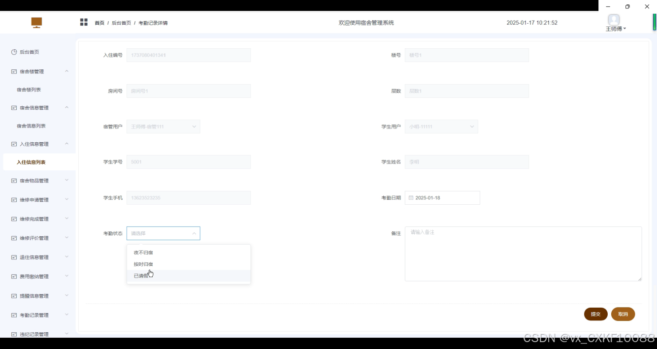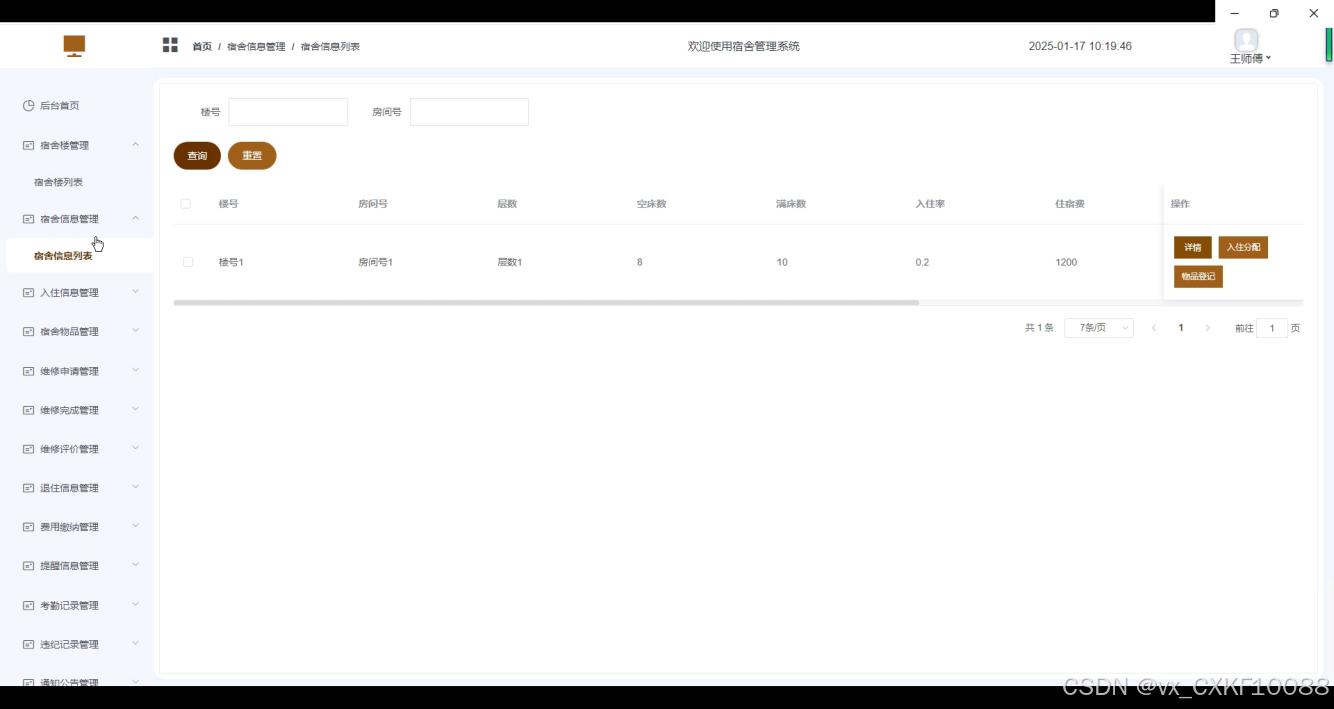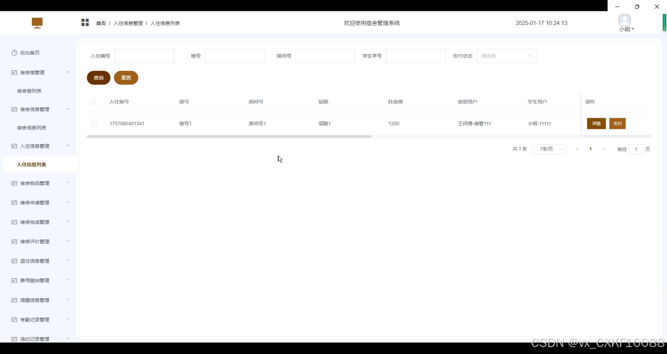 - 入住信息管理:宿管用户可以查看每个学生的入住信息,如入住时间、宿舍号、入住状态等。对于新入住的学生,宿管可以及时进行住宿安排;对退宿学生,也可以进行信息更新。