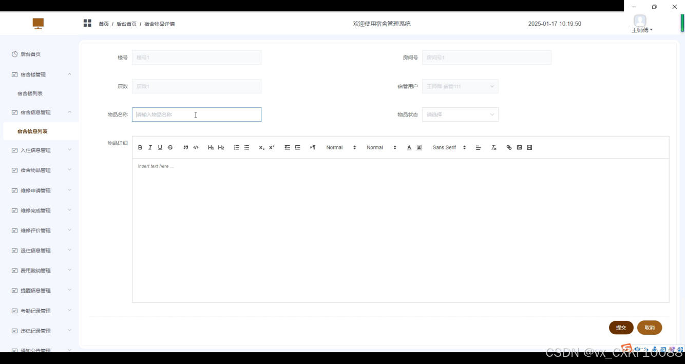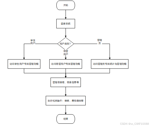 - 宿舍物品管理:管理宿舍内的物品清单及物品状态,安排物品采购或更新。
