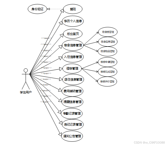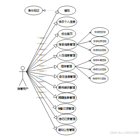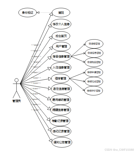 - 维修申请管理:管理员审核和处理宿管或学生提交的维修请求,安排维修人员进行处理。