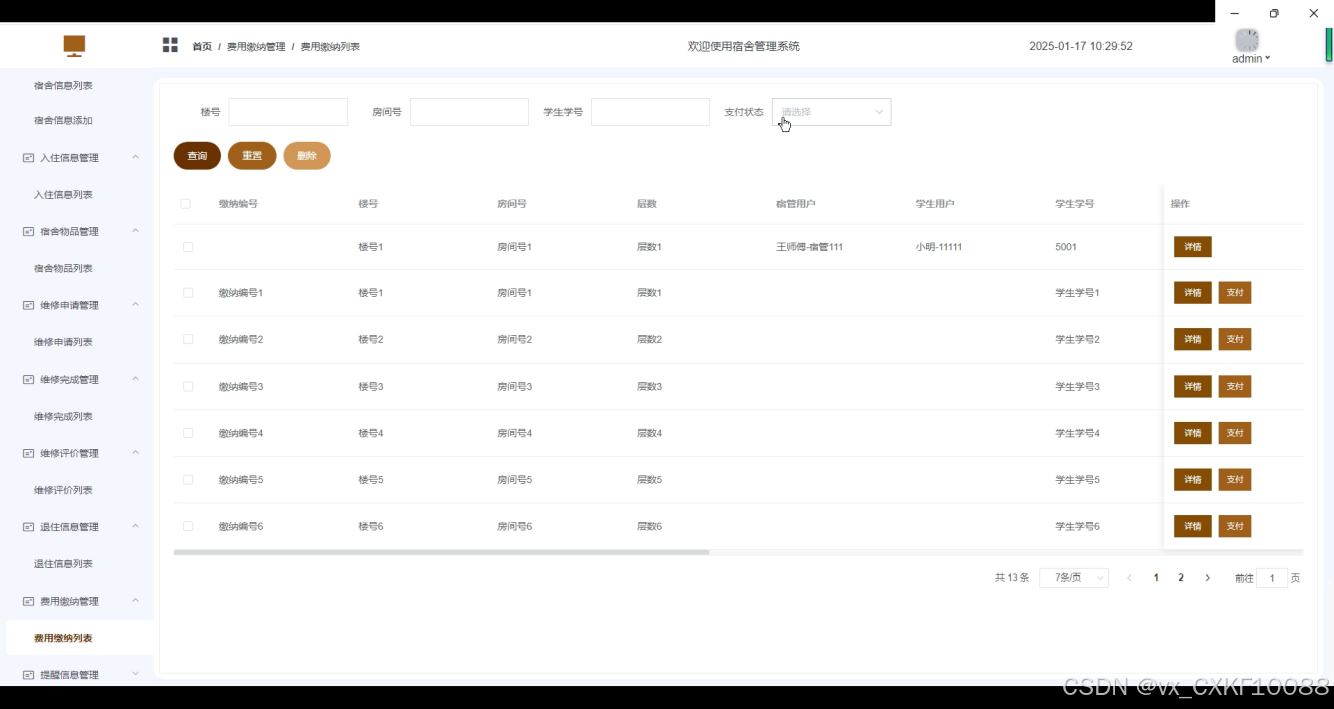 - 费用缴纳管理:宿管用户可以查看学生的费用缴纳记录,并及时更新费用状态。如果有未缴纳的学生,系统会自动提醒宿管发出催缴通知,并追踪费用缴纳情况。